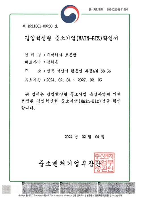 위 업체는 경영혁신형 중소기업 육성사업에 의해 선정된 경영혁신형 중소기업(Main-Biz)임을 확인합니다.