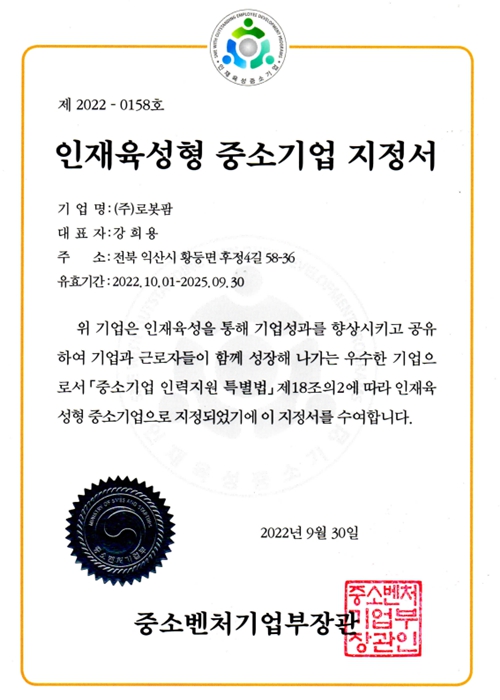 위 기업은 인재육성을 통해 기업성과를 향상시키고 공유하여 기업과 근로자들이 함께 성장해 나가는 우수한 기업으로서 [중소기업 인력지원 특별법] 제 18조의 2에 따라 인재육성형 중소기업으로 지정되었기에 이 지정서를 수여합니다.
