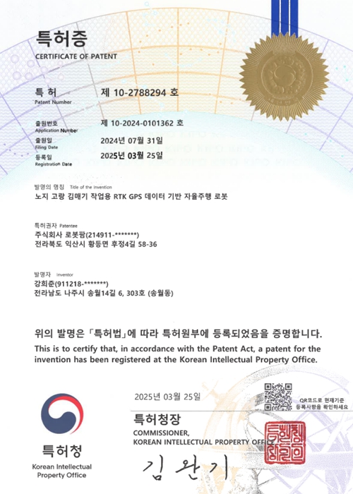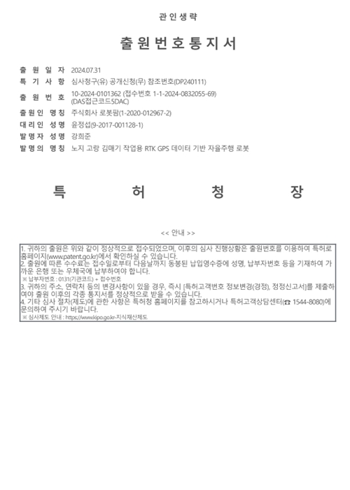 발명의 명칭 : 노지 고랑 김매기 작업용 RTK GPS 데이터 기반 자율주행 로봇